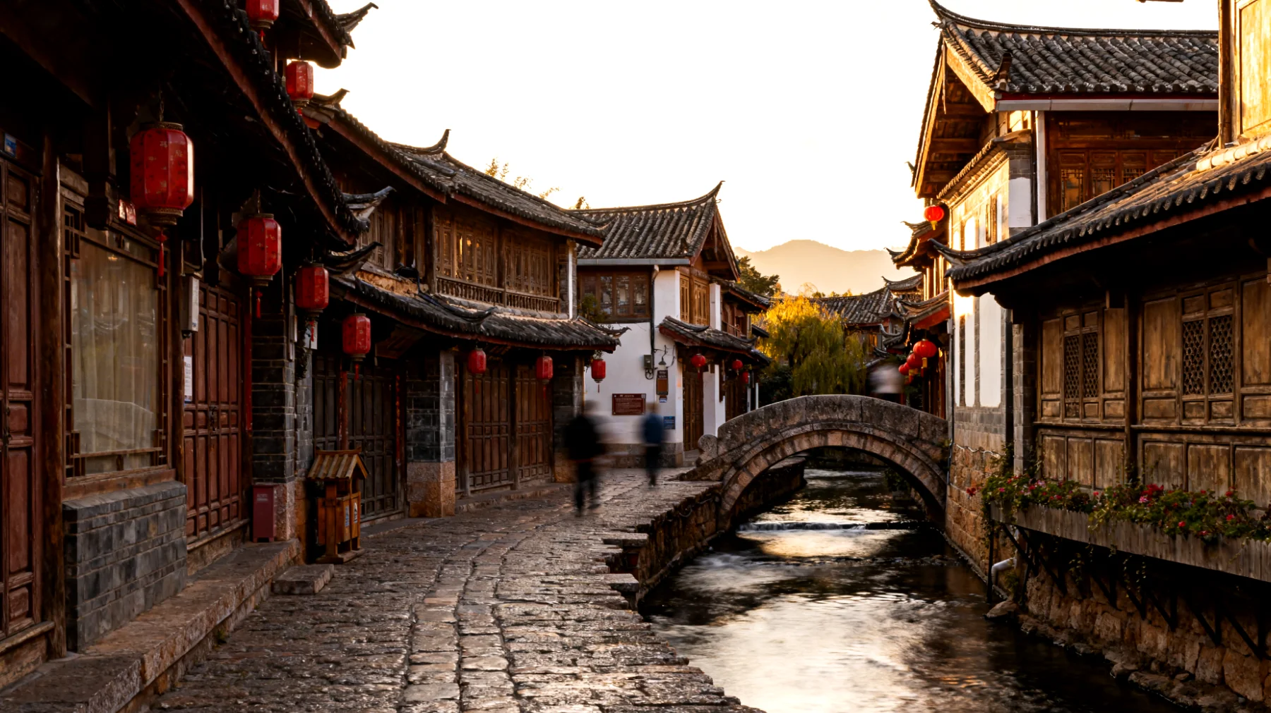 Il cuore pulsante di Lijiang è il suo labirinto di stradine acciottolate che si snodano tra case in legno e pietra dalle caratteristiche facciate scure. A differenza di molte antiche città cinesi ricostruite, Lijiang mantiene un’autenticità tangibile. Perdetevi volontariamente nei suoi vicoli: ogni angolo nasconde cortili segreti, botteghe artigiane dove ancora si pratica la calligrafia Dongba (l’unico sistema pittografico vivente al mondo) e ponti di pietra sotto i quali scorrono i canali alimentati dalle acque di scioglimento delle montagne.